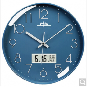 上海牌 66609钟表 挂钟客厅万年历钟表北欧简约石英钟表挂墙卧室时钟薄边日历挂表 66609带日历蓝框蓝底(直径26cm).