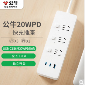 公牛/BULL GNV-U1203F 插座 20W PD苹果快充插座/插线板/插排/接线板 Type-c口+USB口+3位分控 全长1.8米